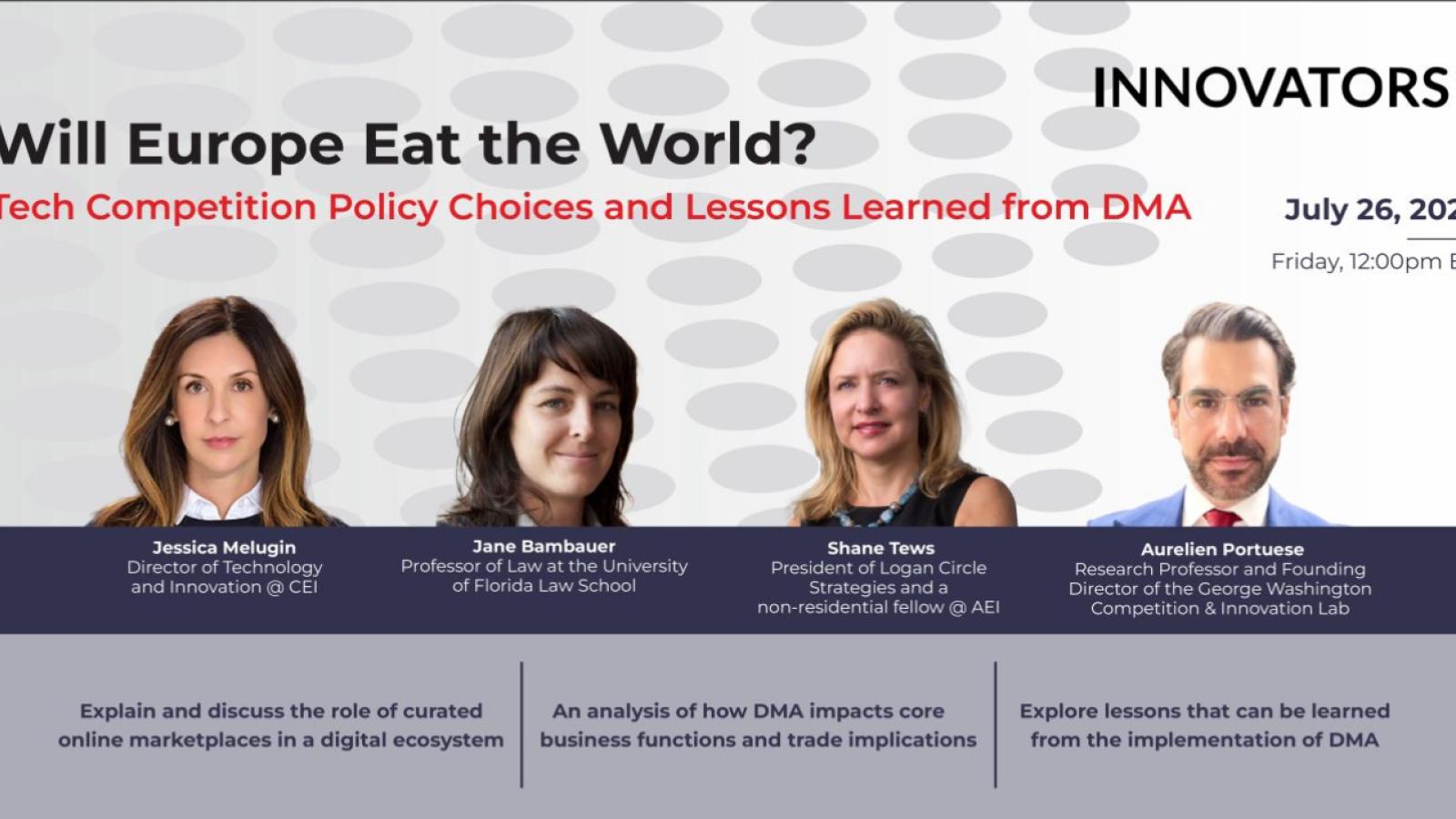 Our panel on July 26th, “Will Europe Eat the World?”, featured three experts in platform competition, digital privacy, and security to discuss the effects of DMA and its global ripple effects. Given Congress’ continued appetite for “reining in” COMs, our discussion illuminated domestic proposals through the lens of the DMA’s experiences. With many countries contemplating similar regulations, the question arises: What are the EU’s true intentions, and how will these new regulations affect small business innovators?